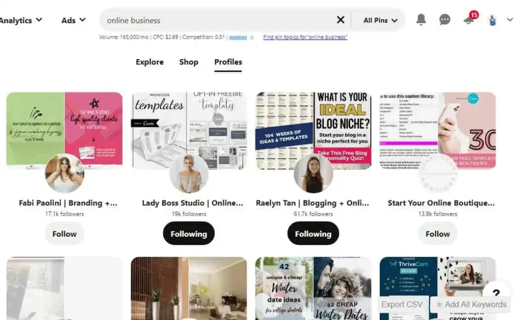 Add keywords related to the person’s interests, location, or profession to refine your search results. You can also utilize filters provided by Pinterest to narrow down results by boards, pins, or accounts.