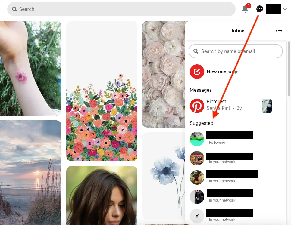 Pinterest analyzes your search queries and saved content to recommend accounts with similar interests. To access this feature, navigate to your Inbox and scroll past your Messages until you reach the Suggested section. There, you’ll find suggestions based on your activity and preferences.