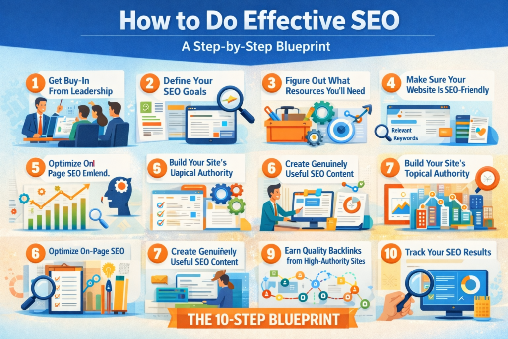 Fix technical issues → target the right keywords → create valuable content → build authority → track performance